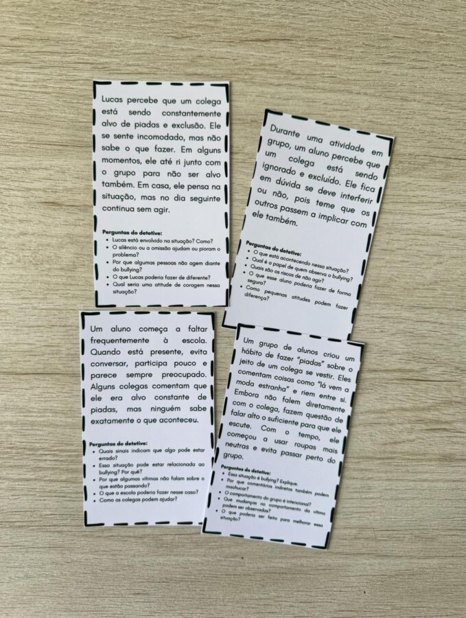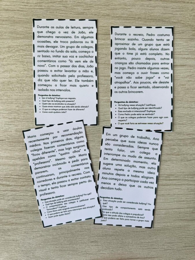 Os alunos leem as situações, analisam como “detetives” e propõem soluções para combater o bullying.